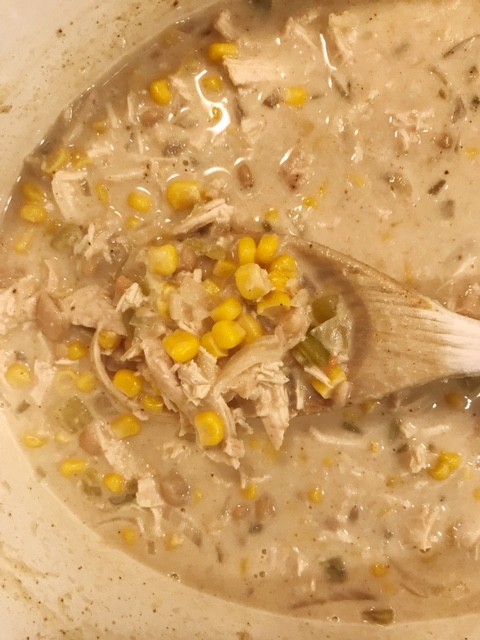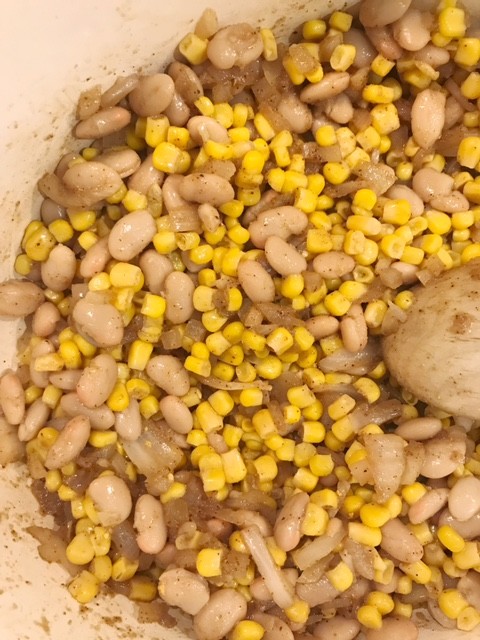 - Add in the onions, corn, beans, chiles, salt & pepper (to taste), cumin, and chili powder. Stir around and cook until onions are soft and the seasonings are fragrant.