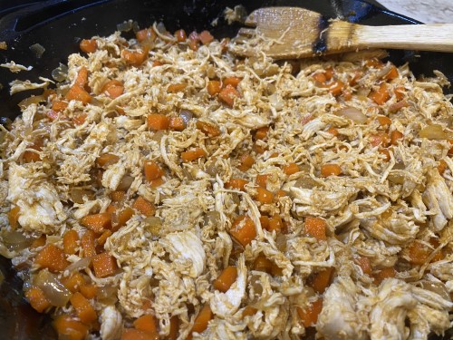 Finally, add in a pound of cooked chicken. I had this in the freezer so just thawed it and threw it in.