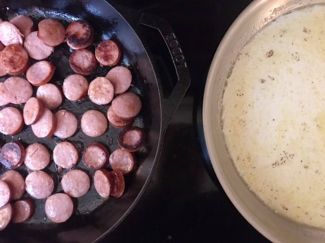 - In a large skillet over medium-high heat, brown the sausage slices on both sides, about 6 minutes total.