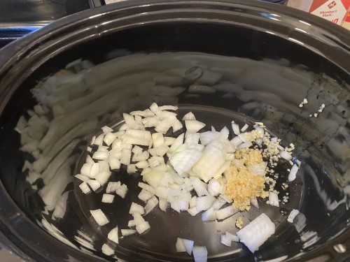 First you’re going to chop the onion and add it and the garlic to the slow cooker.