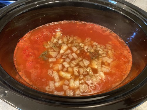 - Add the first 6 ingredients (through the tomatoes) to your slow cooker. Give it a stir and cook on low for 6-8 hours.