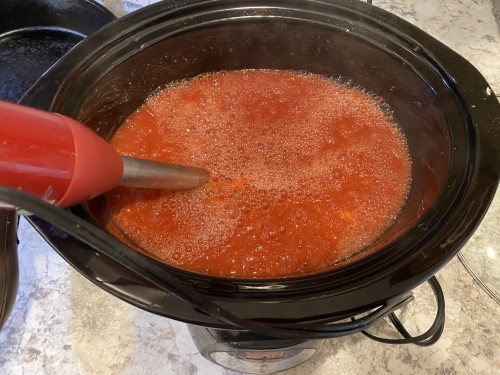 When it’s done, it will not look like what you may imagine tomato soup should look like, so I prefer to use an immersion blender to blend in the onions.