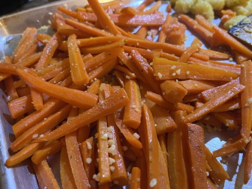I prefer them to be thinner (so do my kids in braces) so I decided to try carrot fries! They were good the first time, but then I started adding garlic and it took them over the top. If you don’t like garlic, they’re still good without!