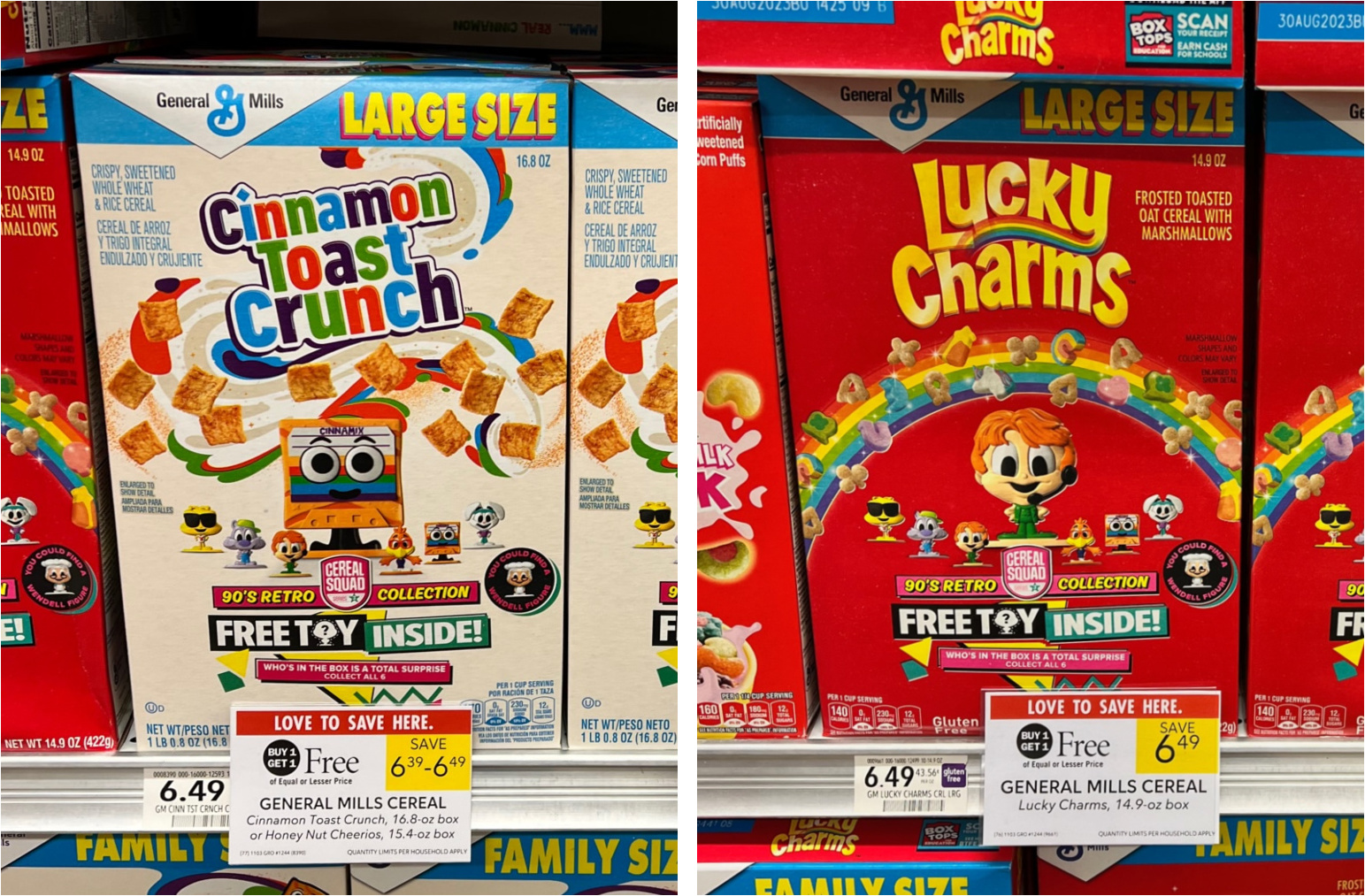General Mills Cheerios Cereal, 11.5 to 16.7 oz, Lucky Charms, 14.9 oz, Chex, 12 to 14 oz, Toast Crunch, 16.8 oz, or Nature Valley Granola, 11 or 17 oz, BOGO $6.49