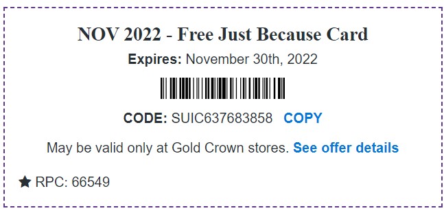 All you have to do is sign up for the free Gold Crown Rewards program. The store coupon can be found on your rewards page.