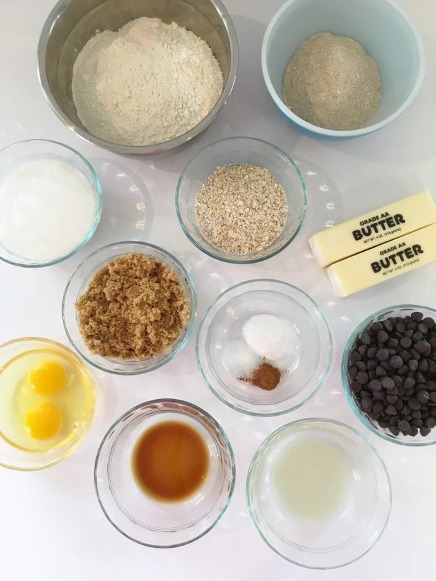 • In a separate bowl, mix the flours, oats, baking soda, salt, and cinnamon.