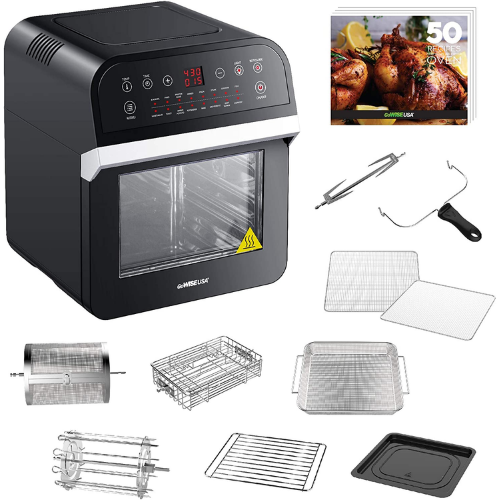 • Includes 10 accessories: Comes with 10 accessories – everything you’ll need to make a homemade meal with ease. Accessories include a rotisserie tong, rotisserie rod, oven rack, drip pan, skewer rotisserie, rotisserie cage, rotisserie steak cage, shallow mesh basket, and two mesh trays.