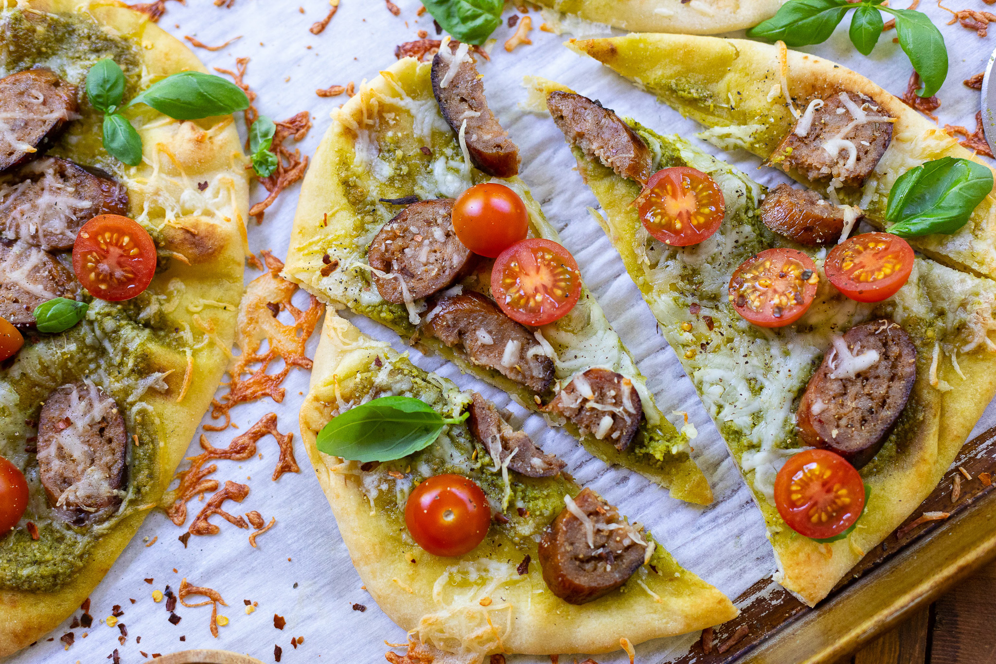 4. Spread 1 ounce of pesto on each naan then top each with the prepared sausage followed by the mozzarella cheese.