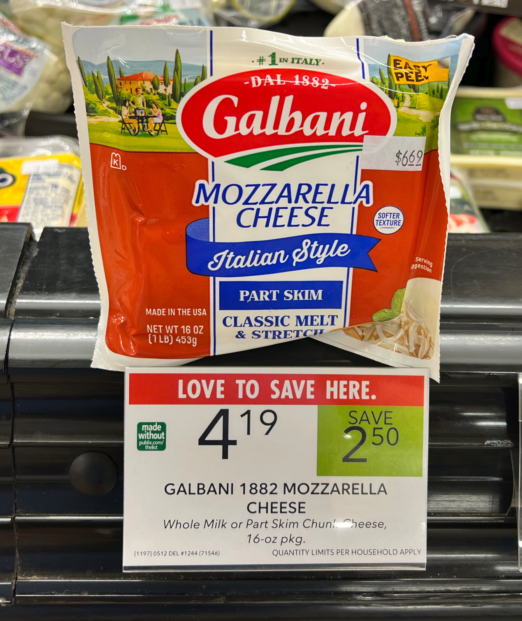 Galbani 1882 Mozzarella Cheese, Whole Milk or Part Skim Chunk Cheese, 16 oz, $4.19 (reg $6.69)
