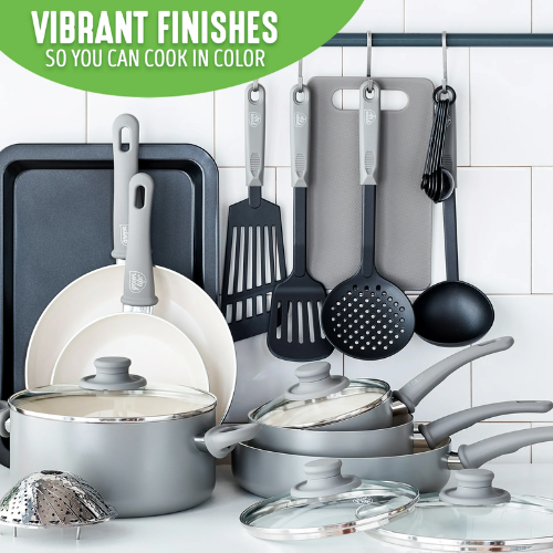 Hop over to Walmart and get a deal on GreenLife 18-Piece Soft Grip Ceramic Non-Stick Cookware Set. Designed for effortless performance and cleanup, this set features our toxin-free Thermolon nonstick coating, which is free of PFAS, PFOA, lead, and cadmium. The pans are also crafted with recycled aluminum, because we want your kids’ kids to cook healthy, too. Finished in vibrant colors, this set is outfitted with stay-cool handles to keep your cooking comfortable. Choose from various colors including Gray, Pink, and Turquoise.