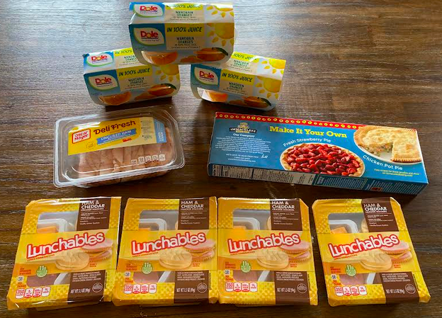 Lunchables/Veggies, Mac & Cheese/Grapes x 2, Peanut Butter & Jelly Sandwiches/Chips/Carrot Sticks x 2, Ham Sandwiches/Mandarin Oranges/Sliced Pears, Leftovers