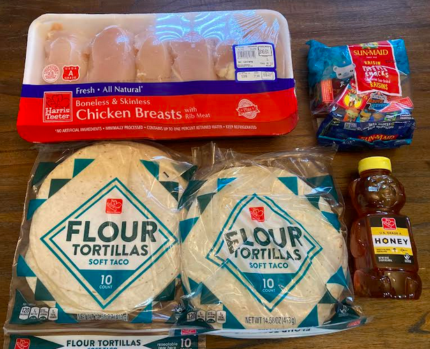 Apples & Peanut Butter/Cucumbers/Pretzels, Peanut Butter & Jelly Sandwiches/Carrot Sticks/Oranges x 2, Turkey Sandwiches/Grapes/Carrot Sticks, Fish Sticks/Fruit x 2, Leftovers