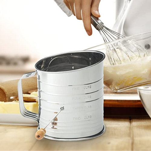 - Mrs. Anderson’s Baking Crank Flour Sifter for breaking up clumps and aerating flour, icing sugar, and other sifted baking ingredients