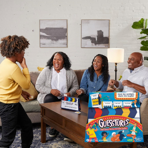 - HIGH-SPEED, HILARIOUS CHARADES: Steal the spotlight and share the laughs with the family-favorite Guesstures charades game. Acting silly with family and friends has never been so fun