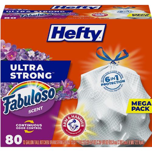 - 13 GALLON GARBAGE BAGS—This package contains 80 Hefty Ultra Strong, Fabuloso scented, 13 gallon kitchen trash bags