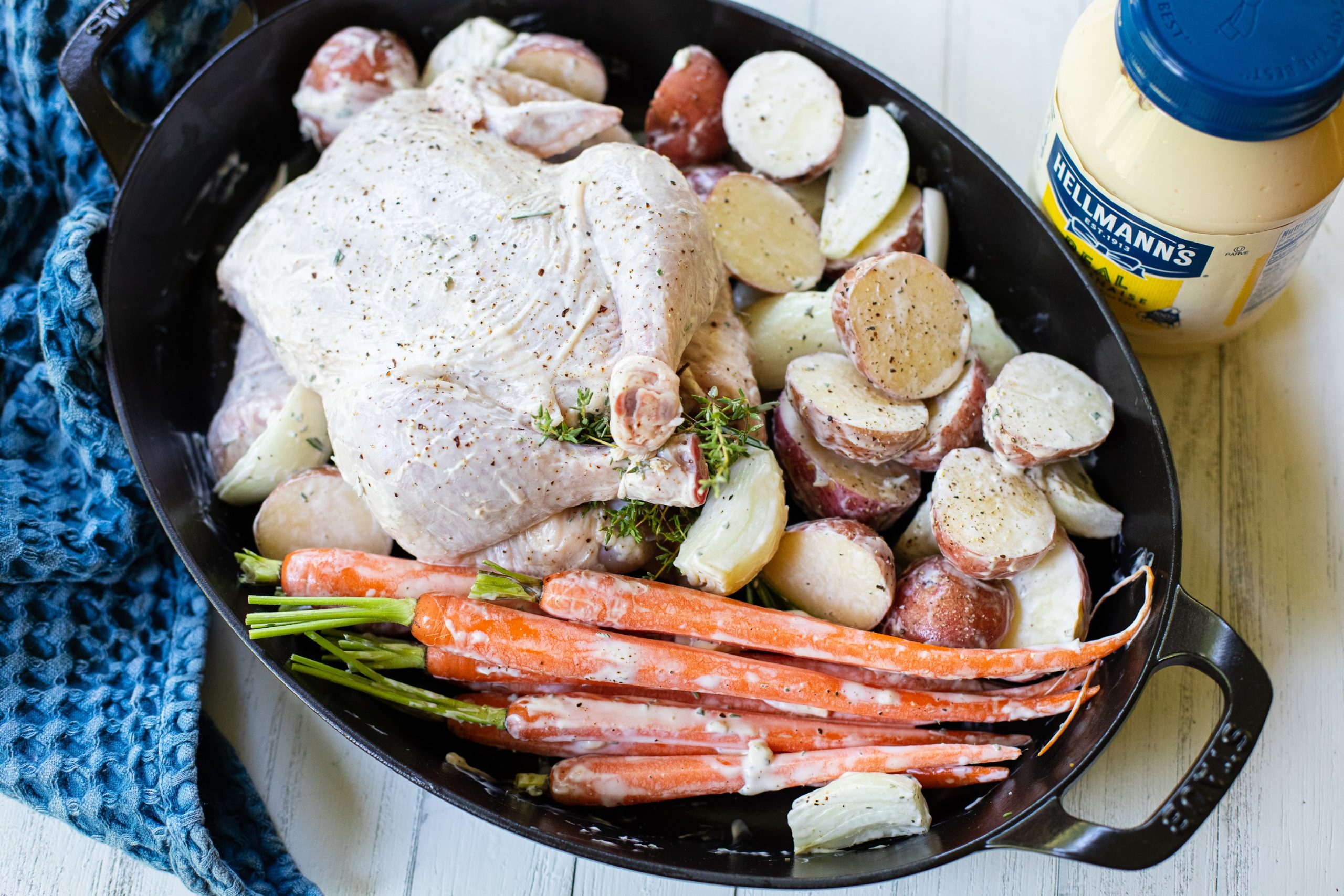 Grab a chicken, some veggies, fresh herbs and a jar of Hellmann’s Mayonnaise and you are in business!
