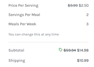 Grab 3 meals a week that serve two people and after the coupon code you’ll only pay $25.97 shipped!  That’s dinner on the table for $8.65 per meal!!