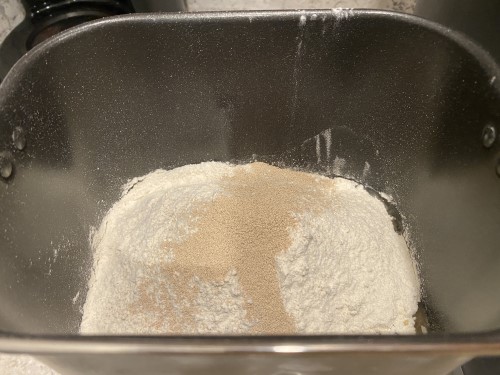 Then add the bread flour (I recommend weighing it, at 512 grams) and the yeast on top.