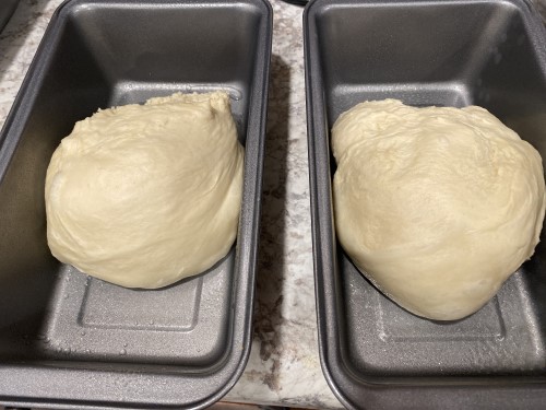 5. Once the dough is ready, divide it in half and place each ball of dough in a greased bread pan.