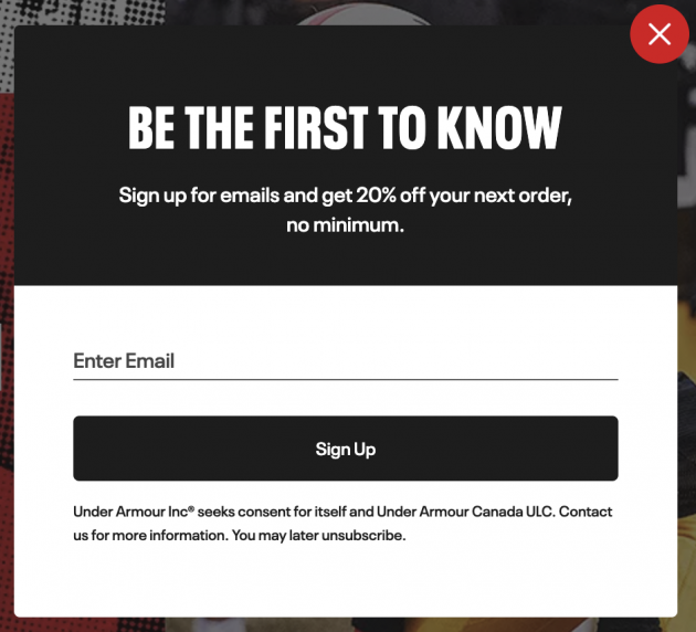 PLUS, if you sign up for emails as a new Under Armour member, you’ll get a unique code via email that gives you an EXTRA 20% off your entire purchase + free shipping! Just look for this box when you first visit the site: