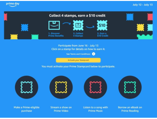Prime Stampcard helps you to navigate what your Prime Membership has to offer. Collect 4 “stamps” to receive your $10 Prime Day credit.