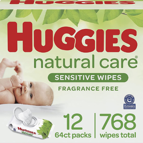 - 12 flip-top packs of 64 Huggies Natural Care Sensitive Baby Wipes, Unscented (768 wipes total); National Eczema Association Seal of Approval