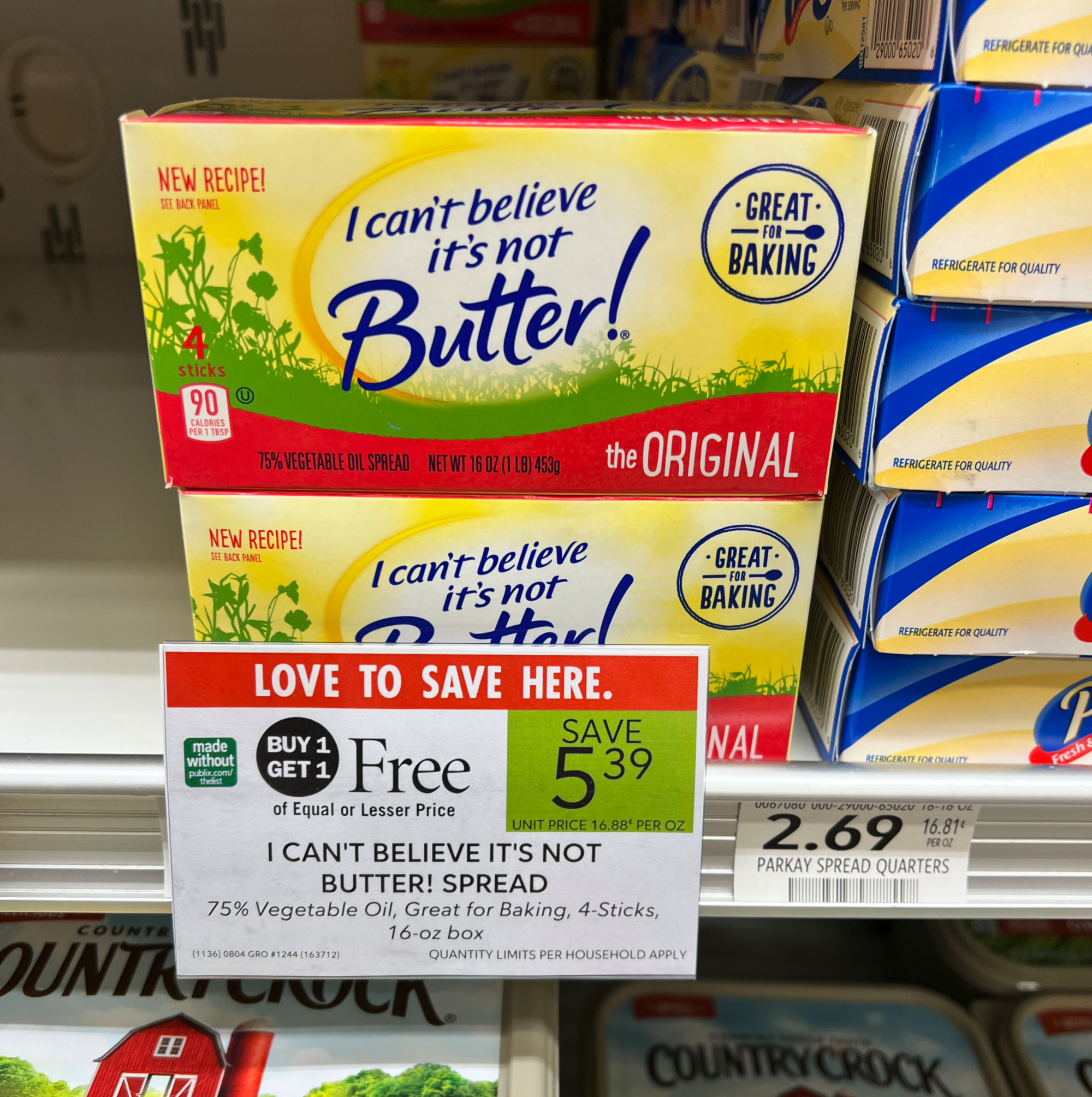 I Can’t Believe It’s Not Butter! Spread, 75% Vegetable Oil, Great for Baking, 4 Sticks, 16 oz box, BOGO $5.39