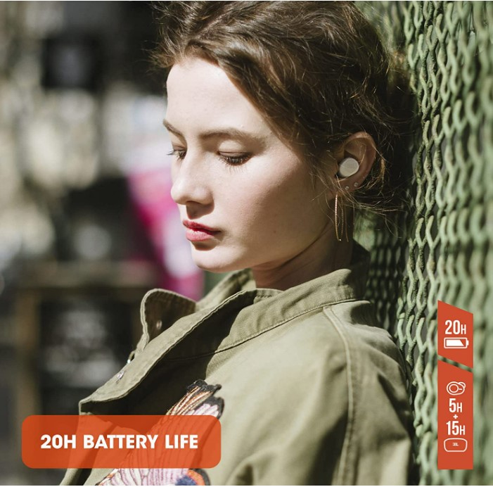 There are three different colors to choose from – black, blue and purple. They have a 20 hour battery life, 5 in the earbuds and 15 in the rechargeable case.