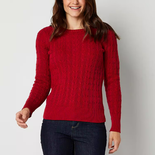 Knitted from a soft cotton-blend with a cable-knit design, this pullover sweater from St John’s Bay women’s collection is a key style for any cold-weather wardrobe.