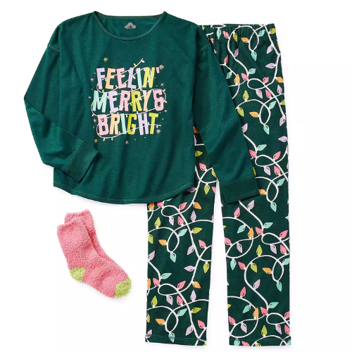 Thereabouts’ 3-piece printed pajama pant set is perfect for your little or big girl or to gift during the holidays. It’s made from soft jersey and includes a graphic crew neck long-sleeve t-shirt, matching elastic-waist pants, and colorblock socks.