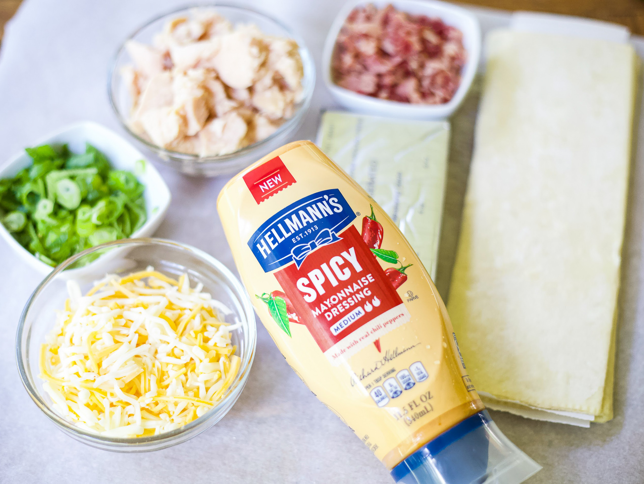 I have made this recipe with both canned and rotisserie chicken and the end result is equally delicious. So to keep things simple and economical, I am sharing the recipe using canned chicken. If you feel the urge, feel free to substitute with any other cooked chicken that you love. But, there is one thing that you can’t change. Skip the regular mayonnaise and pull out a bottle of Hellmann’s Spicy Mayonnaise when you make this recipe. You’ll love the flavor and heat that it adds to this dish. In fact, it’s the kick that those Kickin’ Chicken Pinwheels need!