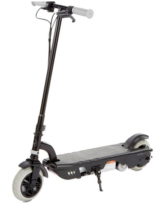 The VIRO Rides Electric Scooter goes up to 10mph. It has a hand-activated rear brake and a kickstand for easy storing. It runs for approximately 40 minutes between charging sessions.