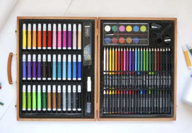 Each kit is filled with 150 pieces of art supplies — crayons, pastels, colored pencils, markers, and so much more!
