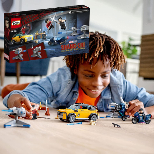 - Includes 4 minifigures – Shang-Chi, Katy, Wenwu and Razor Fist, plus a Morris figure, an SUV, 2 shooter turrets and 2 motorcycles