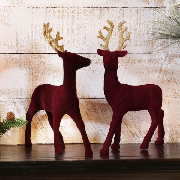 Each deer measures 9″L x 3.5″W x 12.5″H, and can easily be placed on a tabletop. The red wine-colored body and glittery champagne-colored antlers lend a touch of luxury to your home decor.