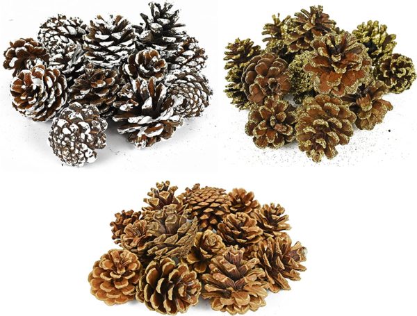 Each cone measures approximately 2-3 inches long, and includes 3 different colors: Wintery White, Glittery Gold, and Natural! Use these for adding a natural touch to your tree. You can try scattering these on tables, putting them in bowls along with ball and poinsettias, or use them for DIY wreaths and decor!