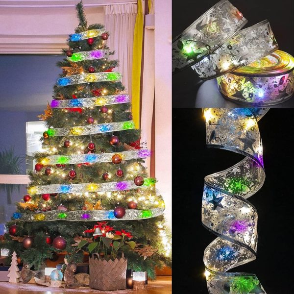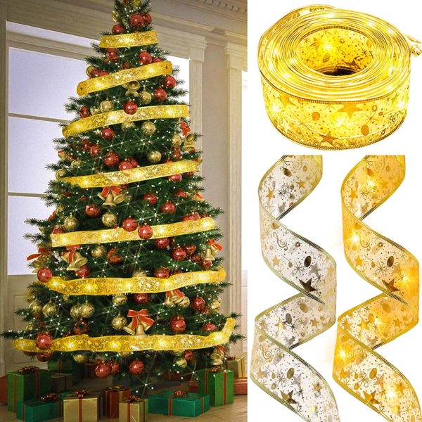 Warm yellow lights are combined with a double layer of printed ribbon to add elegance and warmth to your tree and other areas of your home. This ribbon has copper wire so it’s easy to shape. This is also suitable for other occasions, such as weddings and dinner parties.