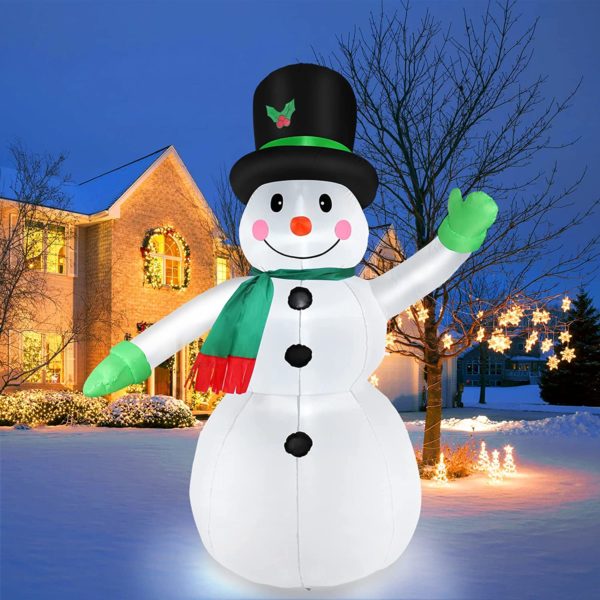 This cute snowman wears a black hat, green gloves, and a red and green scarf. This only takes a minute to inflate and deflate, and comes with a 10 feet long cord, an IP44 Weather proof blower, and UL listed power adapter.
