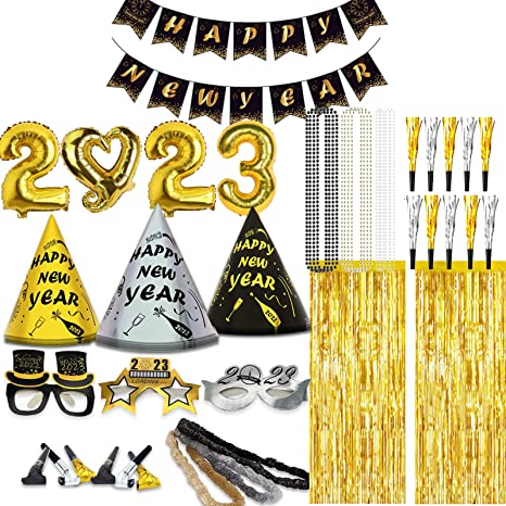 This pack includes 10 hats, 10 glasses, 10 leis, 10 necklaces, 10 squakers, 10 blowouts, 32-inch “2023” foil balloons and 2 foil fringe curtains. If you’re getting this for next year’s party, you can just use the “2023” balloon for different occasion!