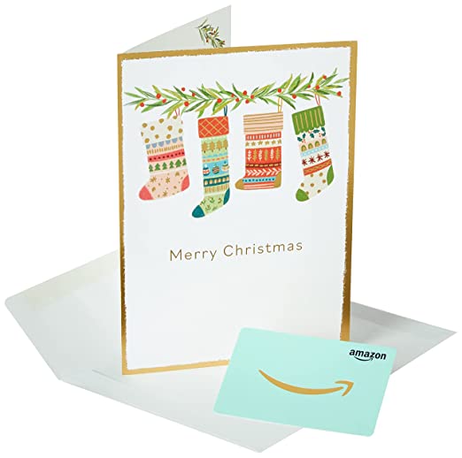 Gift card is affixed inside a premium greeting card by American Greetings. Choose from denominations of $20 to $200. There are different designs for various occasions. For Christmas, choose between the Christmas Stocking and Poinsettia Wreath designs.