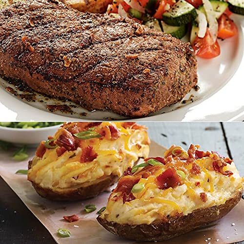 Perfect for THAT person who doesn’t have the time to prep.  Package includes 8 x 5-oz, 28-day aged top sirloin steaks, 8 x 5 oz cheddar and bacon twice baked potatoes, an  Original Steak Seasoning packet, and a free Kansas City Steak Book.