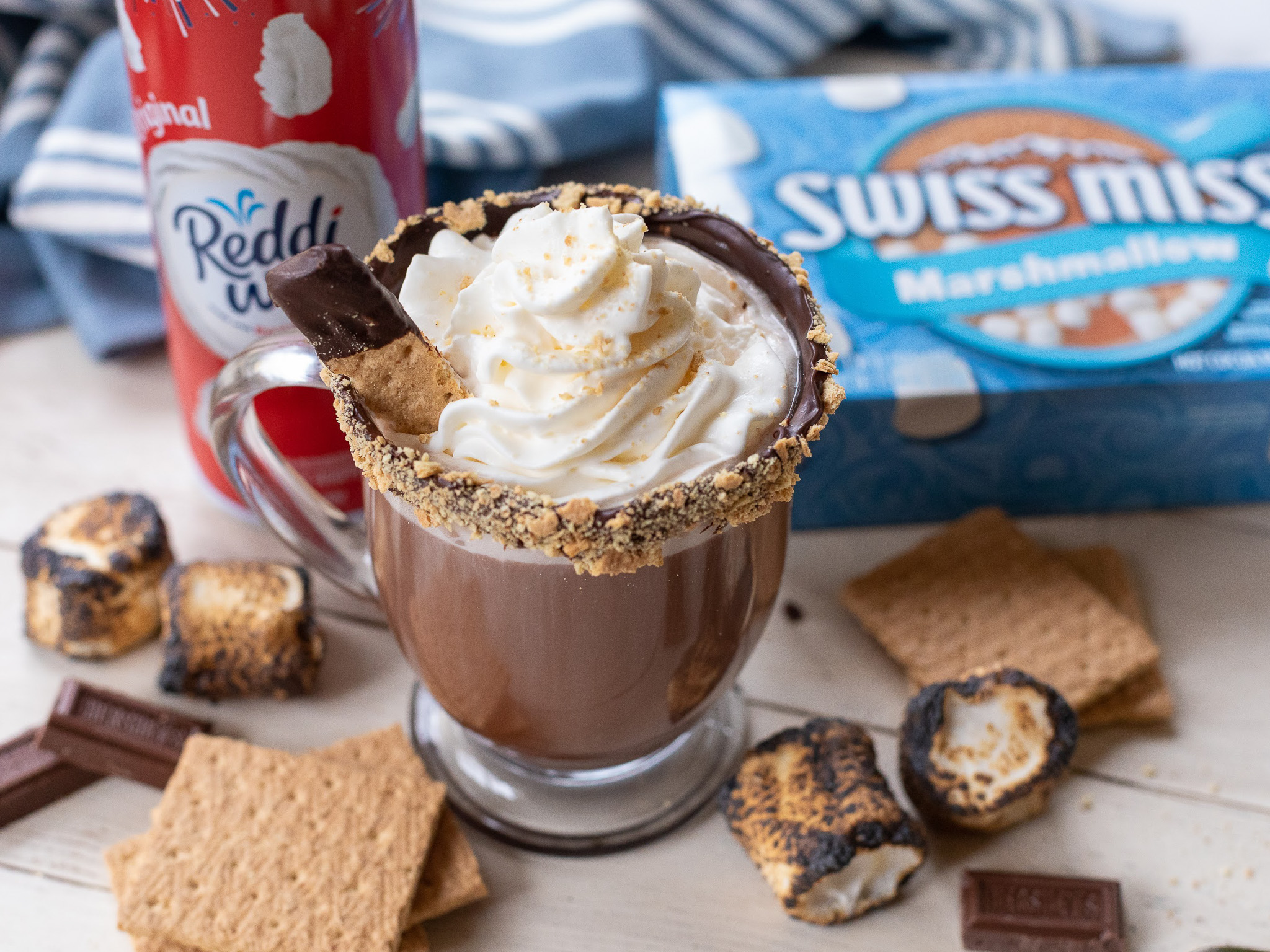 • Empty Swiss Miss® Milk Chocolate with Marshmallow Hot Cocoa Mix into mug. Pour in hot water or milk and stir until dissolved. Top S'mores Hot Cocoa with Reddi-wip® Original Dairy Whipped Topping and graham cracker garnish