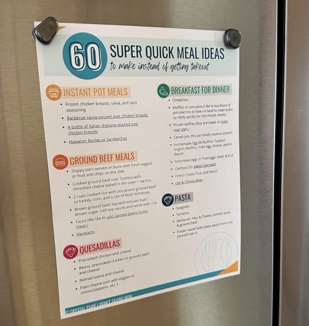 Inside this FREE two-page guide you will find 60 (yes, 60!) quick, easy, and budget-friendly meals you can make instead of getting takeout.