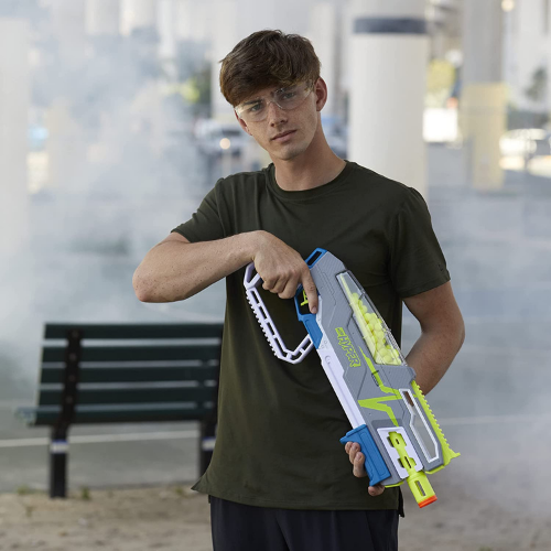 - PUMP-ACTION NERF HYPER SIEGE-50 BLASTER: Pump the slide to prime the blaster and press the trigger to fire at a velocity of up to 110 FPS (hand-powered priming — no batteries required)