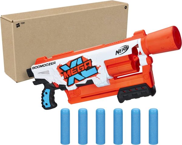 • NERF MEGA XL BOOM DOZER BLASTER WITH XL 6-DART DRUM: The blaster has a rotating drum with 6-dart capacity and fires 1 dart at a time with pump-action priming