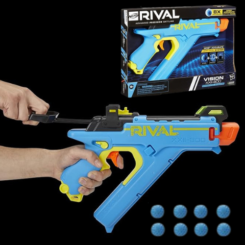 - NERF RIVAL VISION XXII-800 BLASTER: With an 8-round integrated magazine, draw-back priming bar, and trigger lock. Fires rounds at a velocity of 90 feet per second