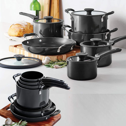 - Heat and shatter-resistant tempered glass lids with a knob that doubles as a spoon rest. Ergonomic, riveted handles that lock together and space pans for more protective storage.