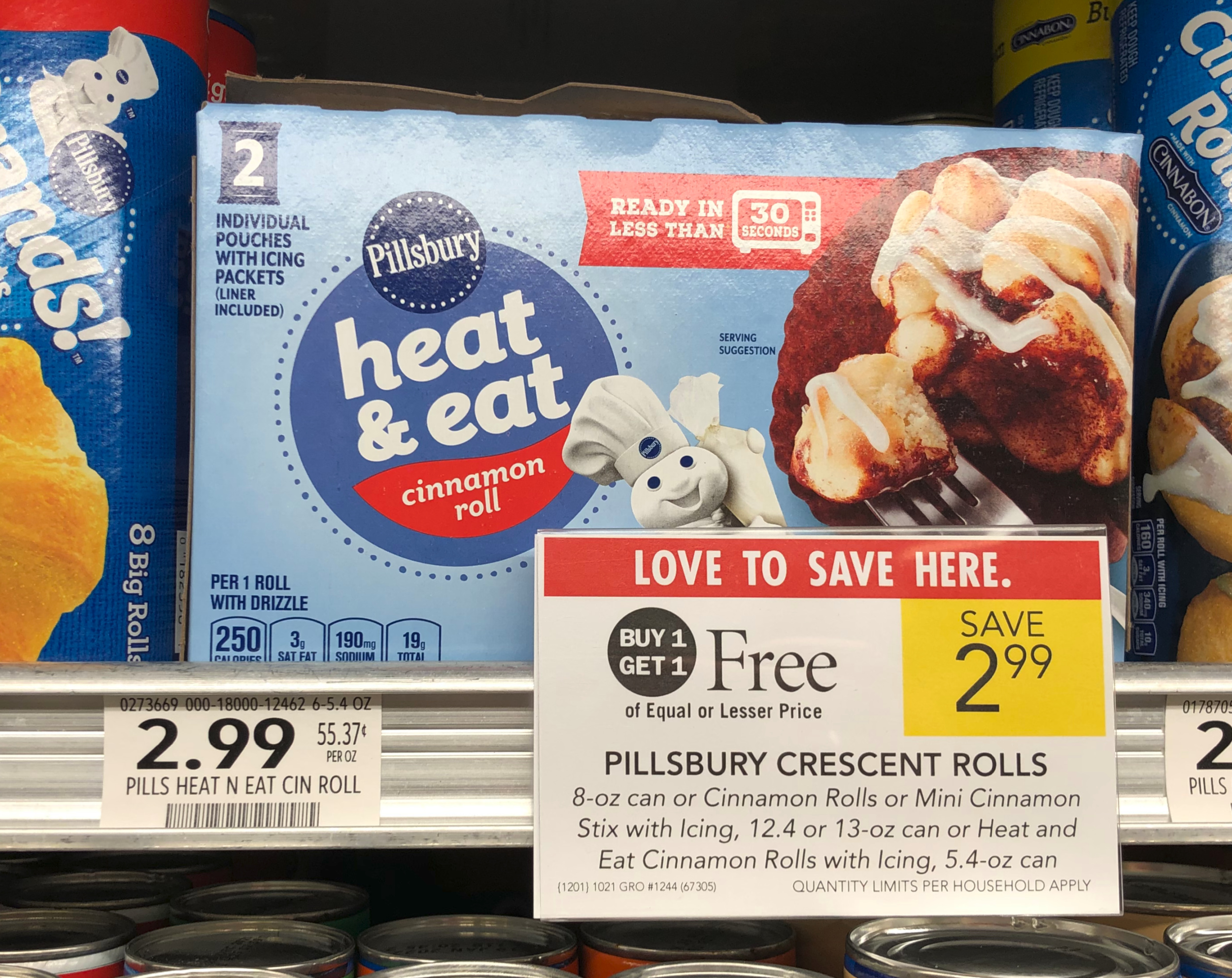 The new Pillsbury baked goods coupon means more sweet treats again this week at Publix. After coupon, you can pick up tubes of crescents or cinnamon rolls or the new Heat & Eat boxes for as little as $1.17 each. Add them to your cart if you need a quick and easy breakfast option.