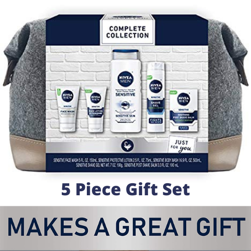 - Gift Set Includes: NIVEA MEN Sensitive Body Wash (16.9 Fl. Oz.), NIVEA MEN Sensitive Face Wash (5 Fl. Oz.), NIVEA MEN Sensitive Shaving Gel (7 Oz.), NIVEA MEN Sensitive Post Shave Balm (3.3 Fl. Oz.), NIVEA MEN Sensitive Protective Lotion (2.5 Fl. Oz.)