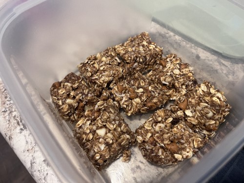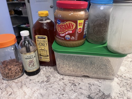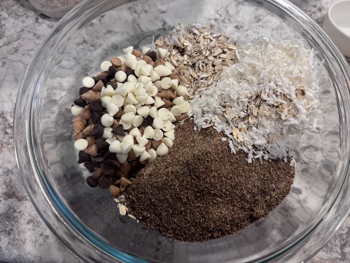 I used rolled oats, creamy peanut butter, unsweetened coconut, honey, vanilla, flaxseed, and a mix of chocolate and butterscotch chips.